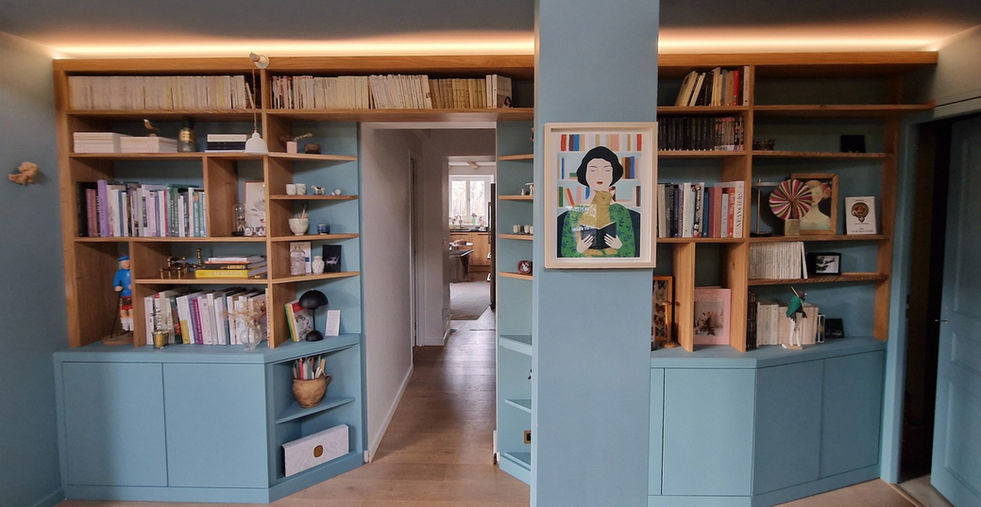 Nous avons réalisé une rénovation intérieure en concevant une bibliothèque sur mesure. Séparée en deux parties, cette bibliothèque mène de manière fluide jusqu'à la cuisine.